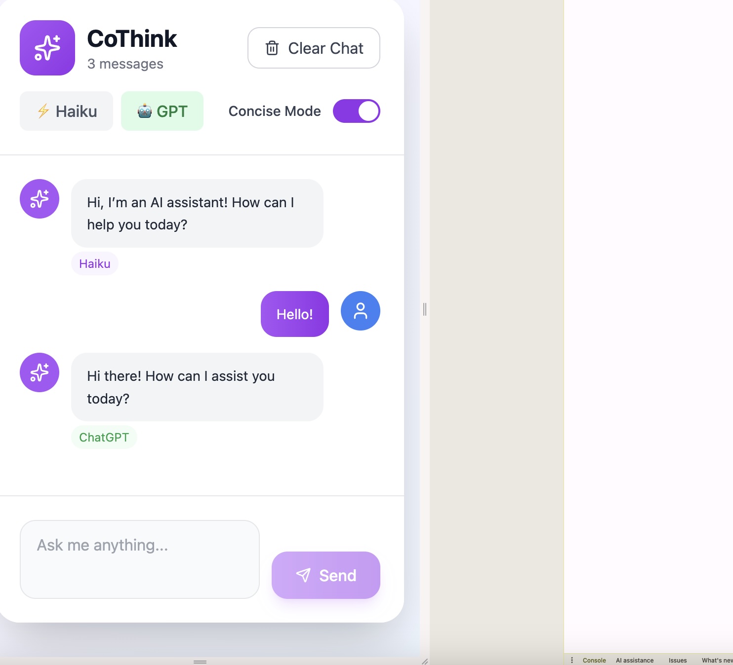 This project demonstrates an interactive AI chat interface where distinct models—collaborate within a single conversation. It features a sleek, responsive UI built with React, dynamic message handling, and a mode toggle for concise or detailed replies. This project highlights real-time state management, API integration, and modern front-end design.