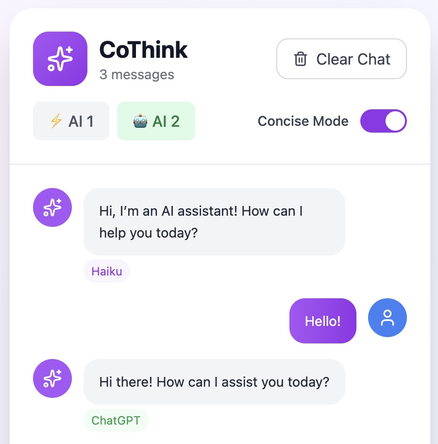 This project demonstrates an interactive AI chat interface where distinct models—collaborate within a single conversation. It features a sleek, responsive UI built with React, dynamic message handling, and a mode toggle for concise or detailed replies. This project highlights real-time state management, API integration, and modern front-end design.